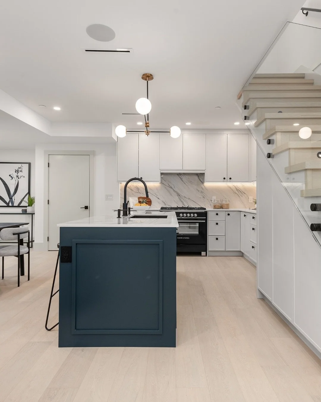 Modern touches come to life through Dekton backsplashes, brushed gunmetal plumbing fixtures, wide plank white oak engineered flooring, and designer lighting throughout. Sleek finishes like large-format matte textured tiles and white oak millwork accents add warmth and sophistication to your space.